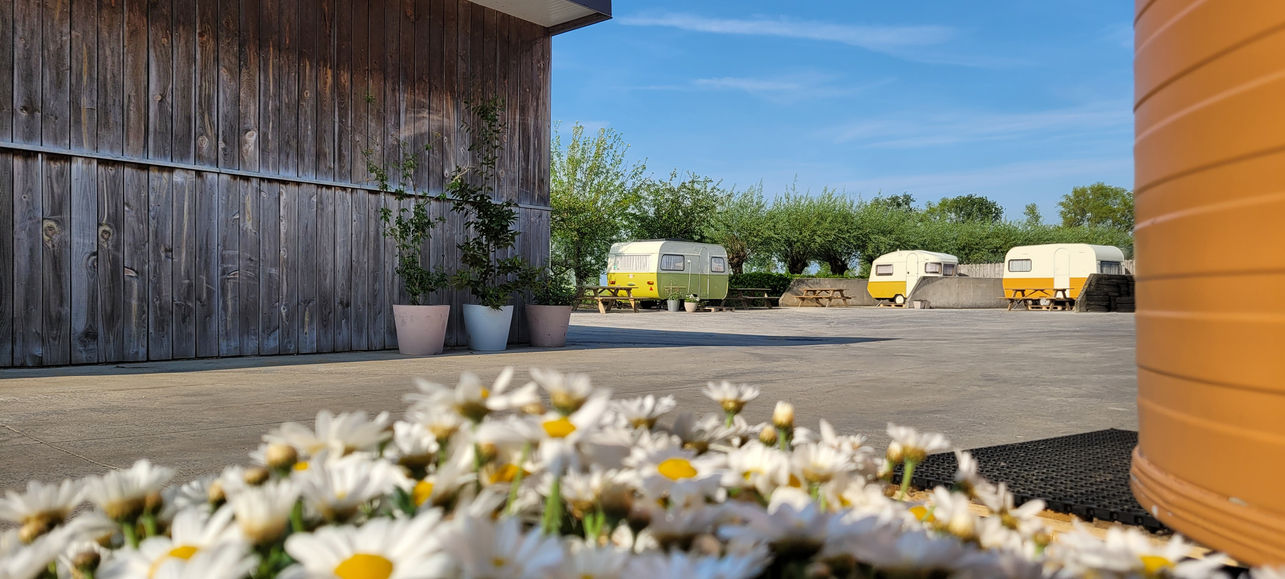 Altijd al eens willen kamperen, maar heb je geen caravan of tent? Onze sfeervol ingerichte retro-caravans (voor maximaal 2 volwassen en 2 kinderen) staan gegroepeerd op een verhard pleintje met picknicktafels en strooien parasolletjes en kunnen met of zonder ontbijt gehuurd worden!